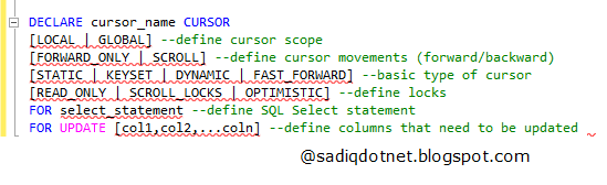 In this article I try to explain the basic of Cursor in SQL Server with a simple example. I hope after reading this article you will be able to understand cursors in Sql Server. I would like to have feedback from my blog readers. Please post your feedback, question, or comments about this article.